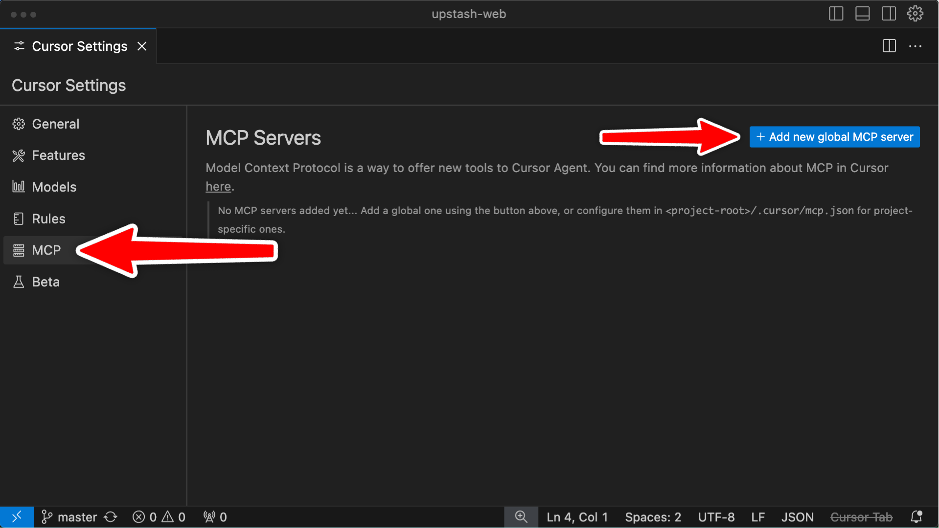 Cursor Settings > Features > MCPand click+ Add new global MCP server. This will open themcp.jsonfile.